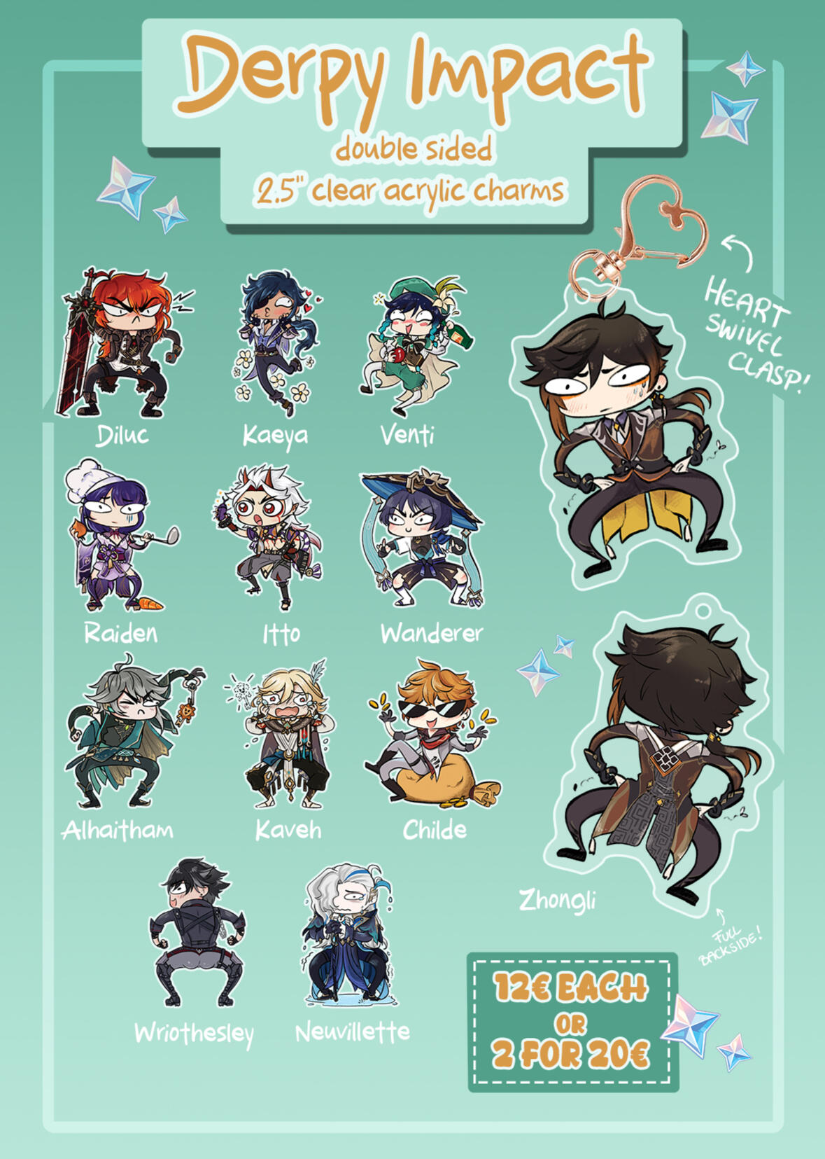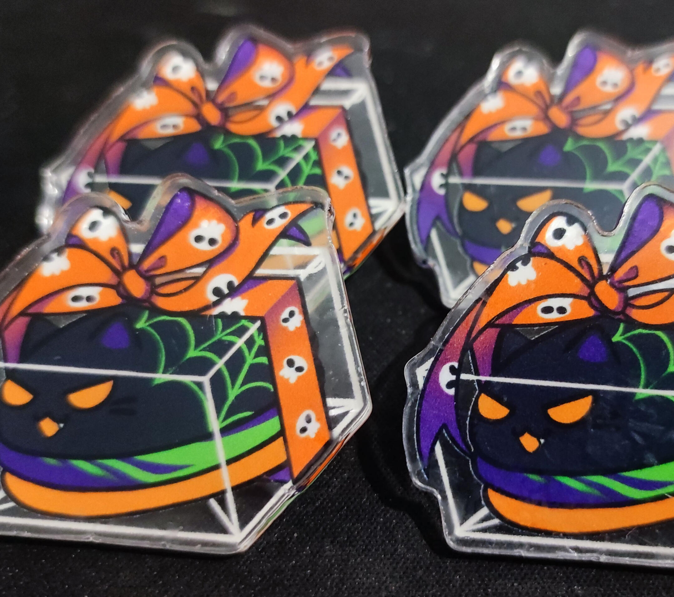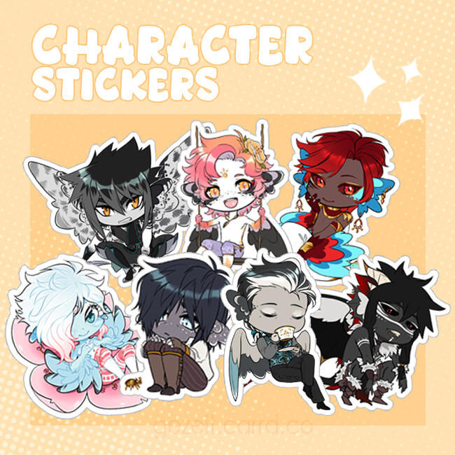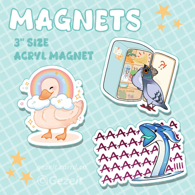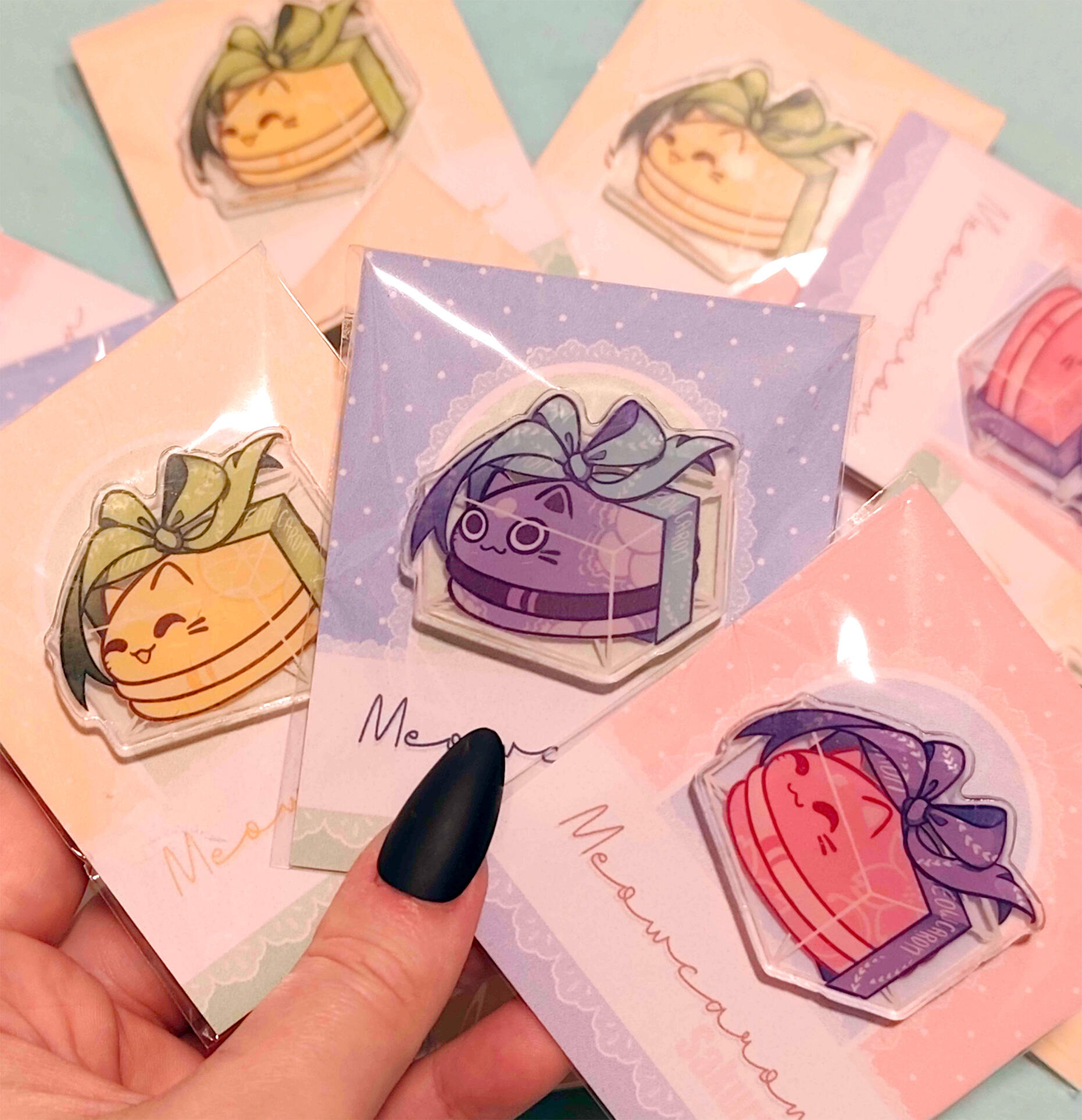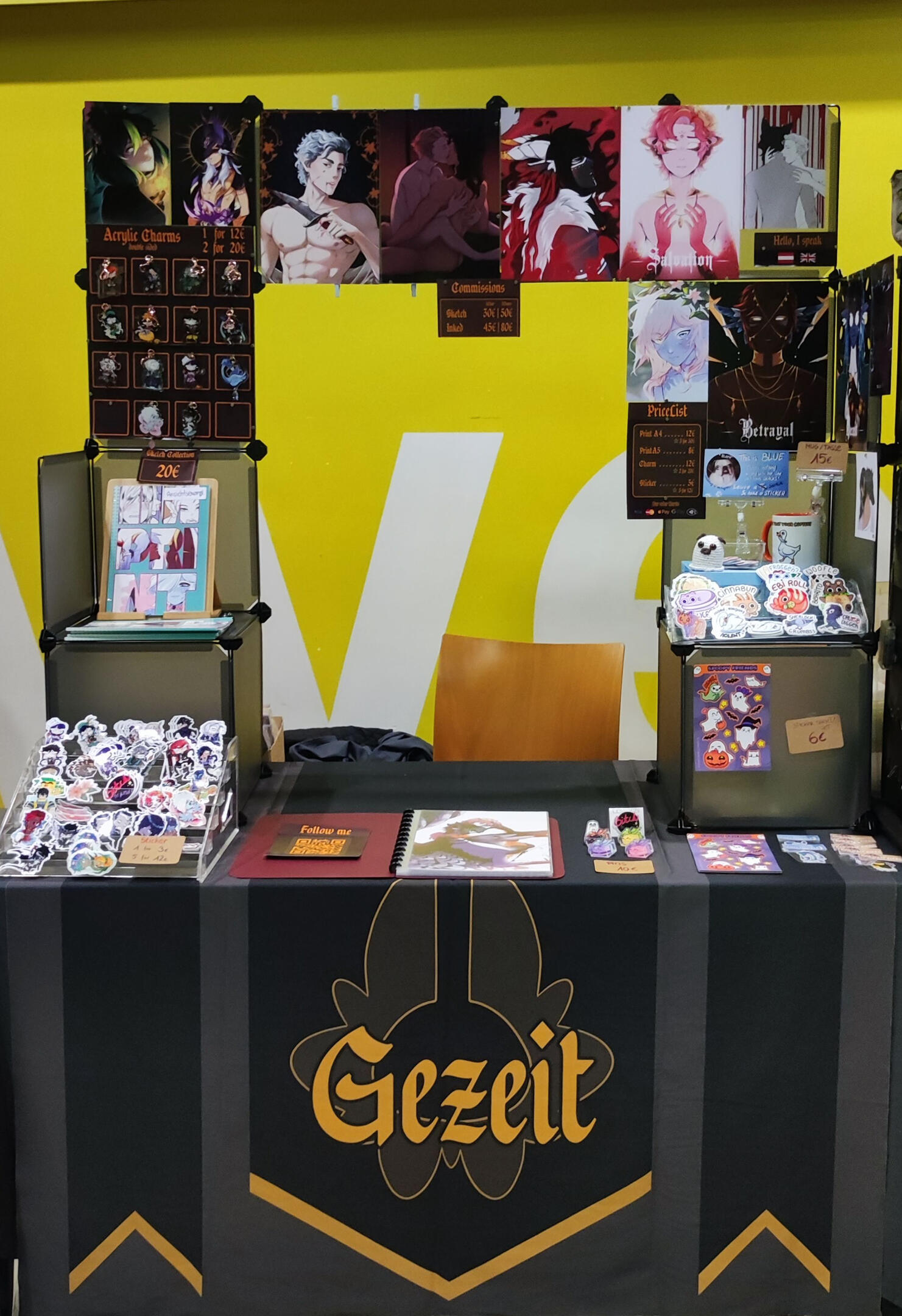 This is a small selection of products available for sale at my booth. I am mainly a print artist but have a variety of acrylic charms and pins, stickers, some mugs or even a limited amount of crochet pugs in stock.